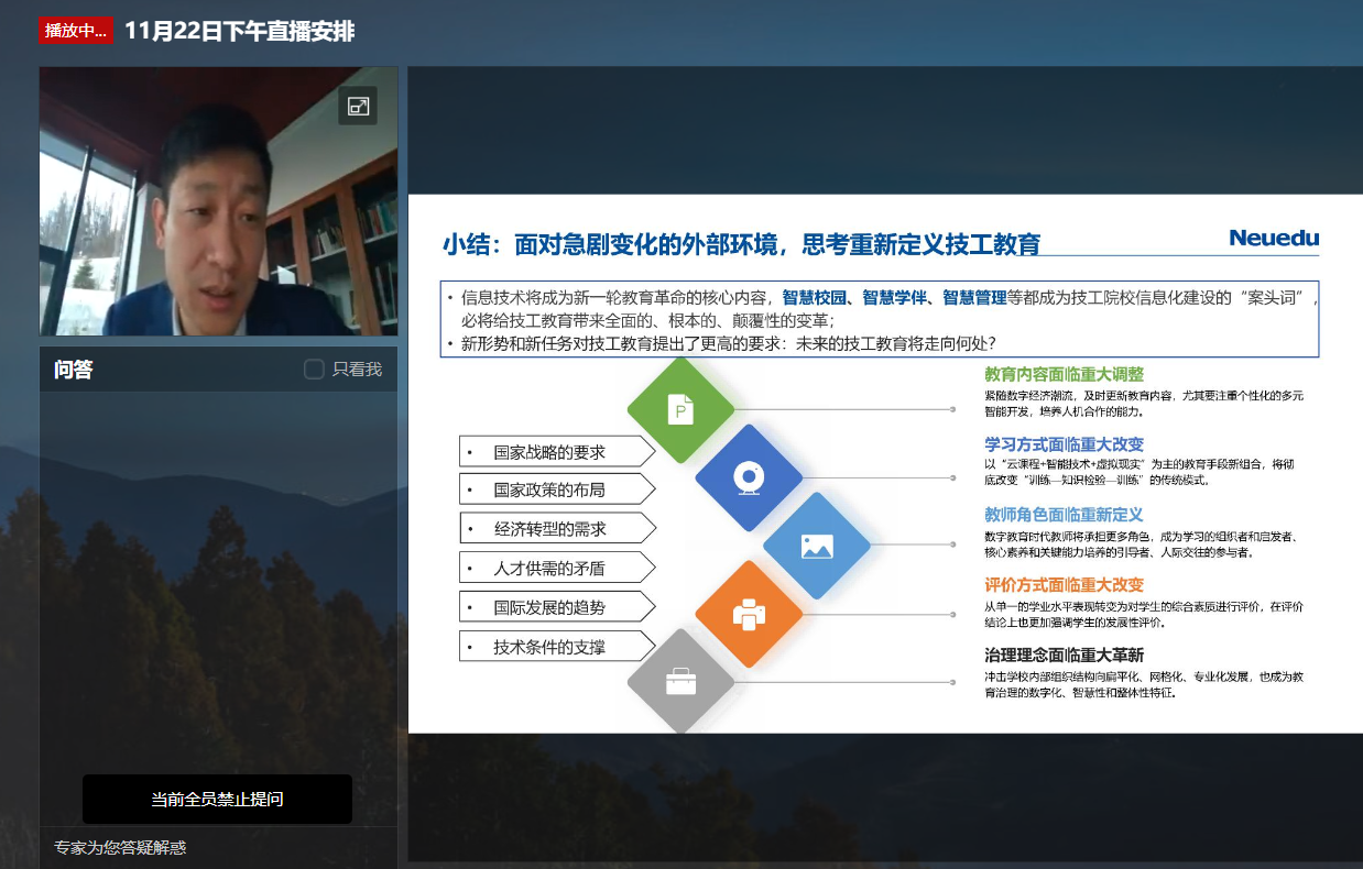 他强调,现在数字校园建设正在从“有边界”走向“无边界”,教学改革从“统一标准”走向“个性定制”,专业建设从伴随产业走向领跑产业,教育资源开发从创新引领走向共建共享,信息化意识理念提升从以教师为主体到全员参与,教育资源建设投入从政府主导走向多元参与,全国技工院校应该主动识变、求变、应变,持续把握数字化、智能化时代开展变革的大势,构建数字化、智能化、个性化、终身化的教育体系。